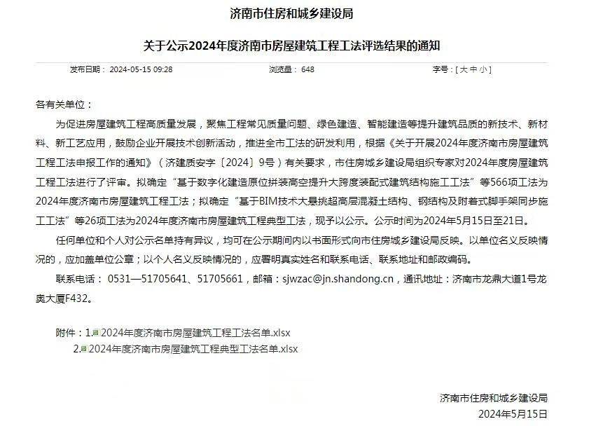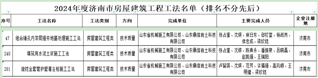 近日,濟南市住房和城鄉建設局公布2024年度濟南市房屋建筑工程工法評選結果,公司申報的《組合錘孔內深層強夯地基處理施工工法》《填筑用水泥土漿施工工法》《旋挖全套管護壁灌注樁施工工法》三項工法全部入選,獲評2024年度濟南市房屋建筑工程工法,標志著公司科技創新工作又取得了新的突破。
